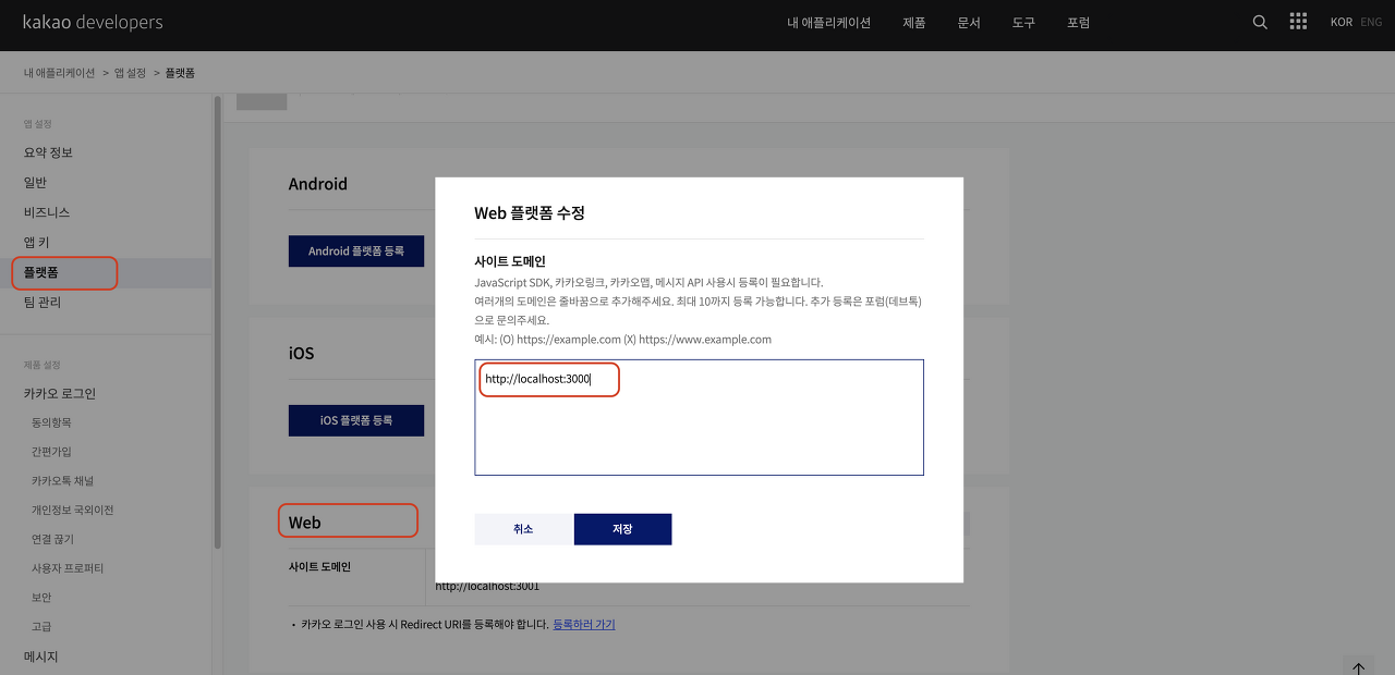 2. 플랫폼 -> Web에서 공유할 URL을 넣습니다.