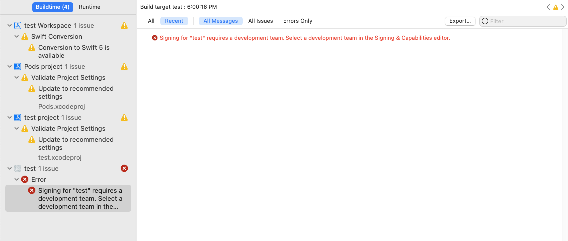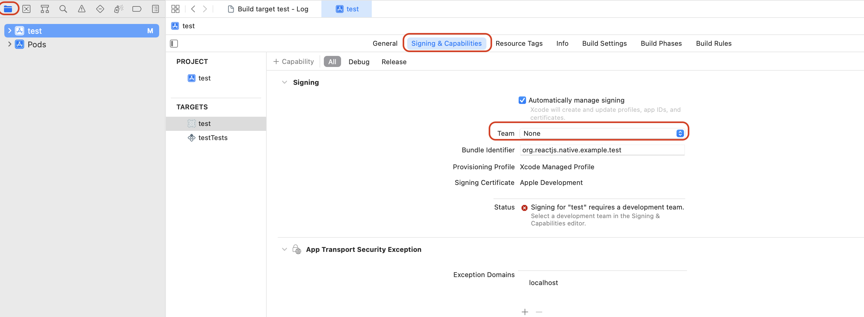 "signing for requires a development team. Select a development team in the Signing & Capabilities editor."