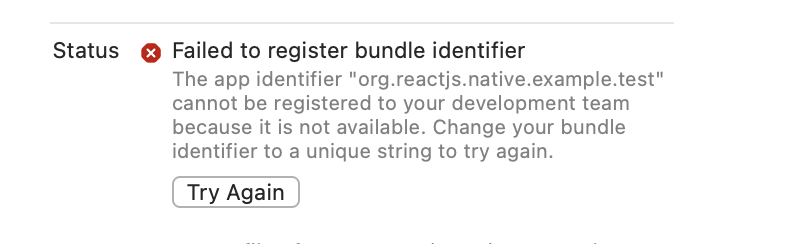 Failed to register bunle identifier