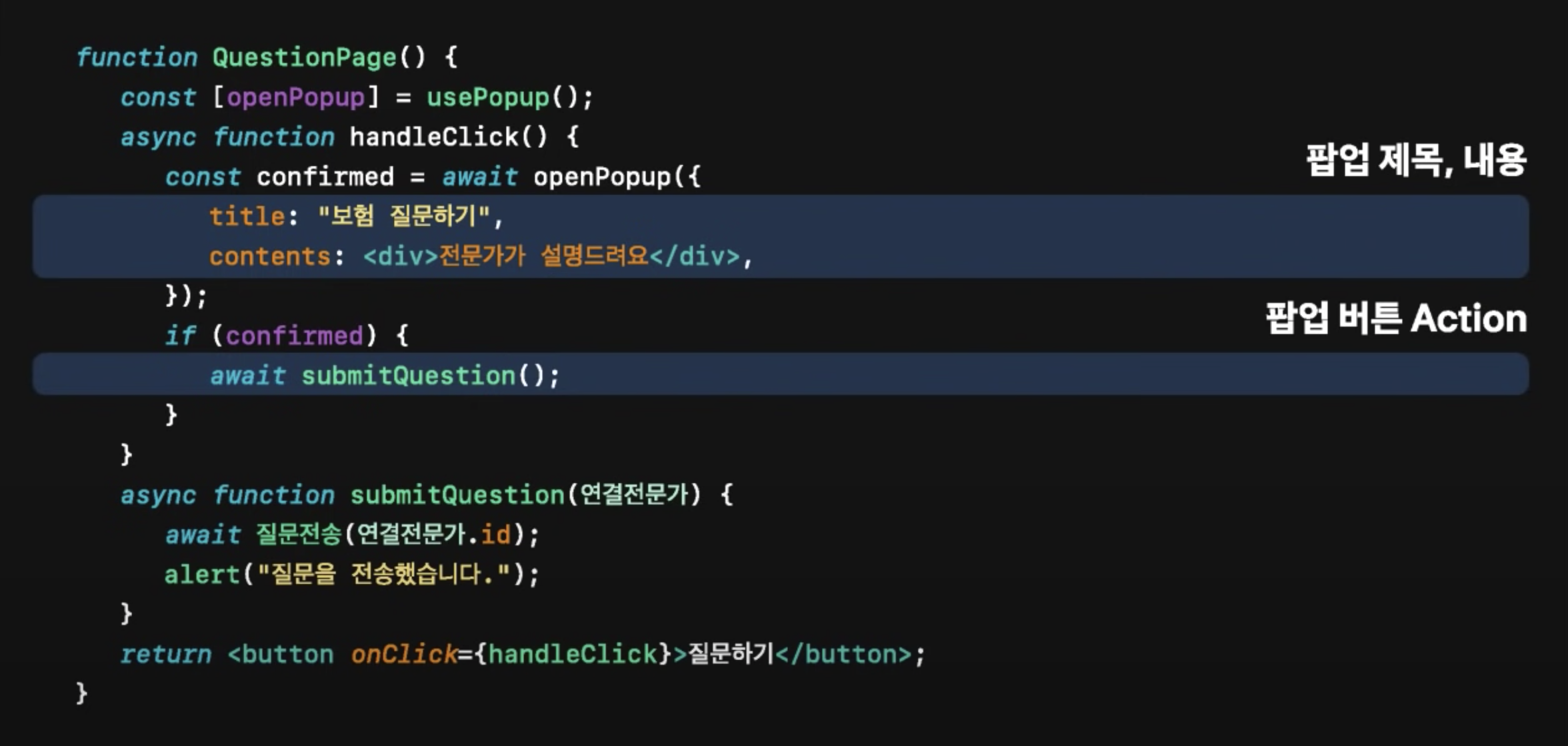 핵심데이터는 팝업의 제목과 내용, 버튼 클릭시 일어나는 함수입니다.