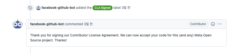 서명을 하게 되면 초록색으로 CLA Signed label을 얻게 됩니다.