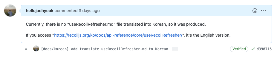 Currently, there is no "useRecoilRefresher.md" file translated into Korean, so it was produced. If you access "https://recoiljs.org/ko/docs/api-reference/core/useRecoilRefresher/", it's the English...