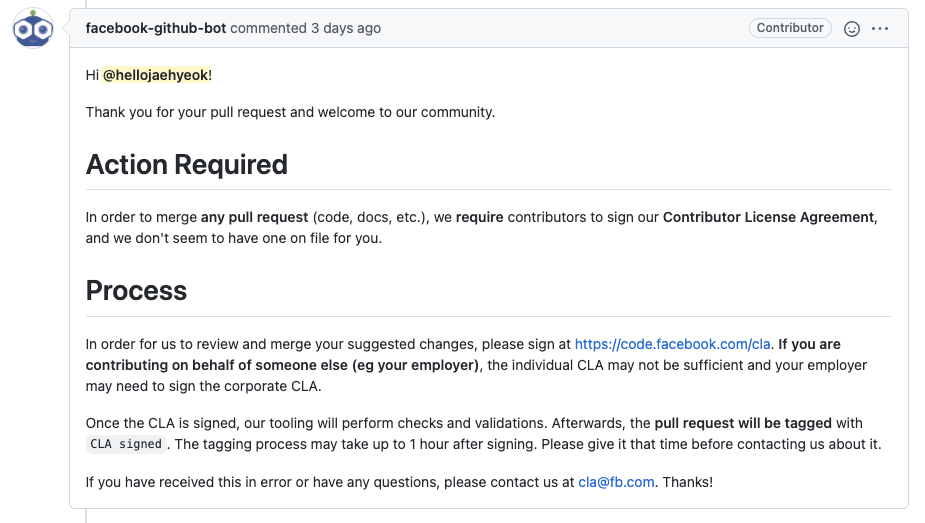 "pull request를 하기 위해서는 CLA(Contributor License Agreement) 권한이 필요하니 링크에 접속하여 서명을 해라"